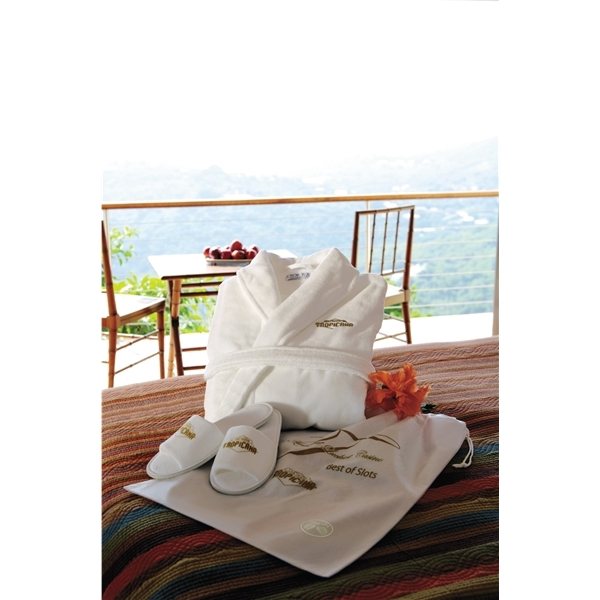- This fabulous gift set includes a deluxe embroidered Turkish Shawl Collar Robe, along with custom imprinted slippers.