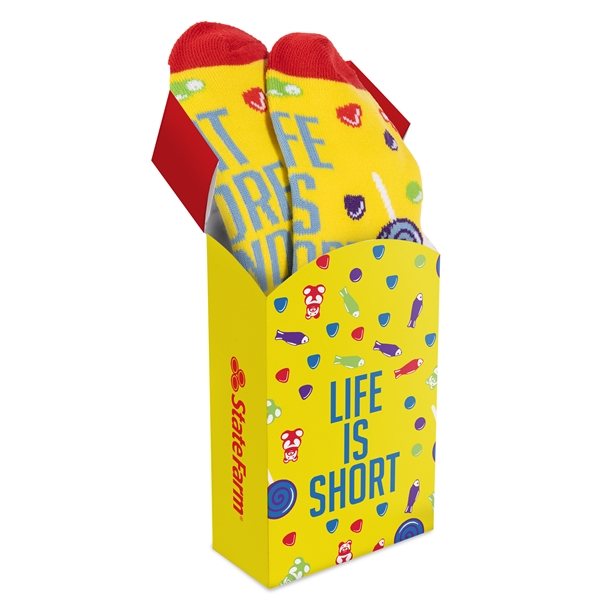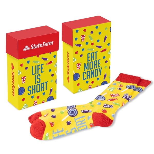 Dress socks feature candy design with "Life Is Short Eat More Candy" slogan on the soles.