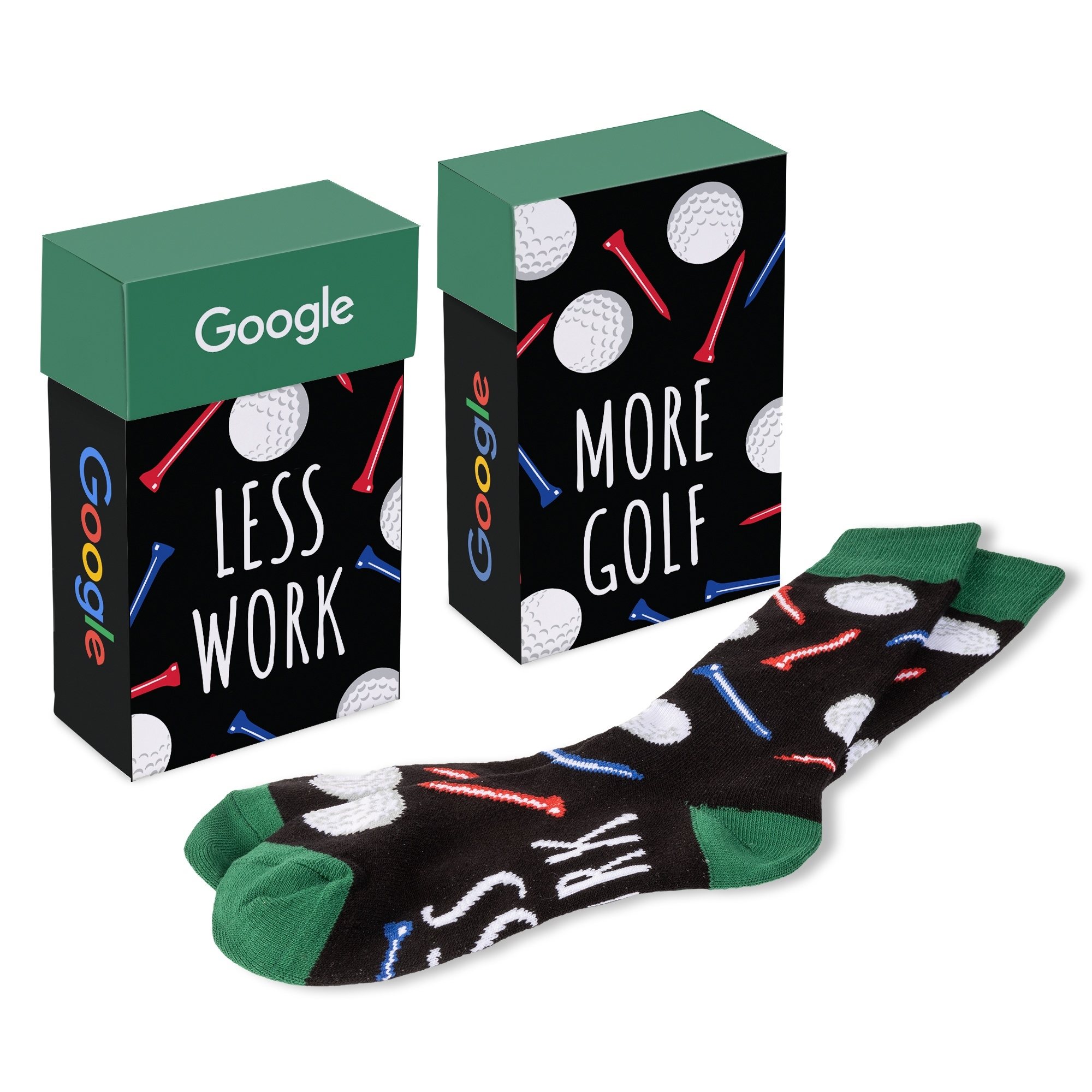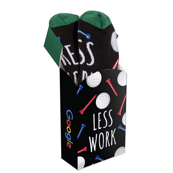 Dress socks feature golf design with "Less Work More Golf" slogan on the soles.