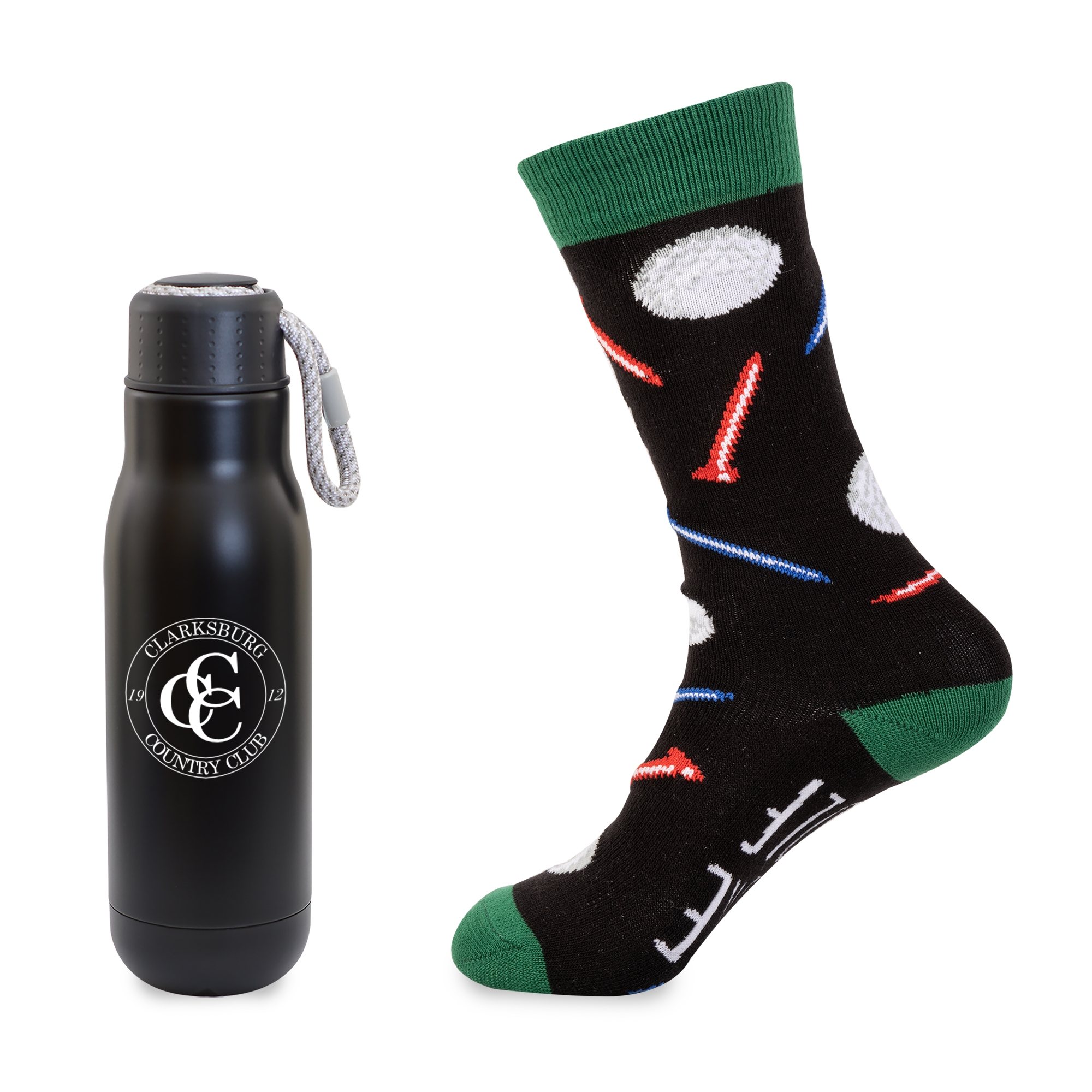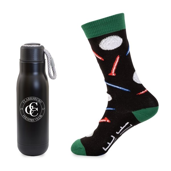 Toe-tally awesome gift set includes our 16 oz, bungee lid bottle and ACE brand dress socks featuring golf design and "Less Worry More Golf" on the soles.