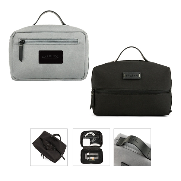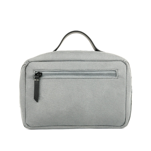 - Water-repellant and made from post-consumer water bottles, this easy-to-carry accessory bag has a top handle, a main zippered compartment with mesh zippered interior pockets, a top zippered compartment and a backside zippered pocket.