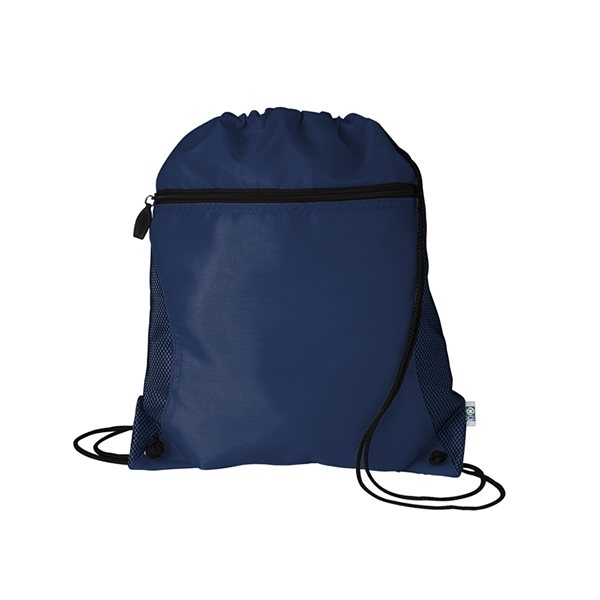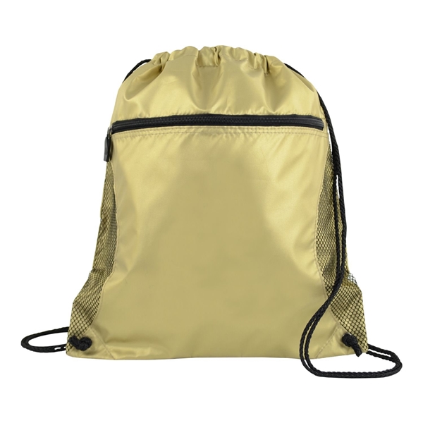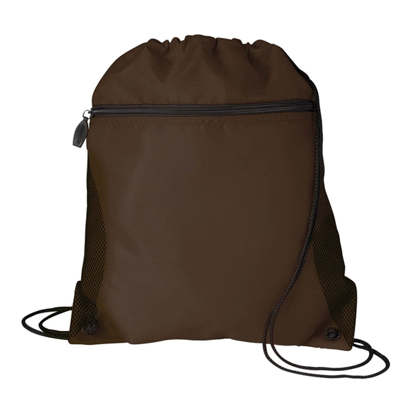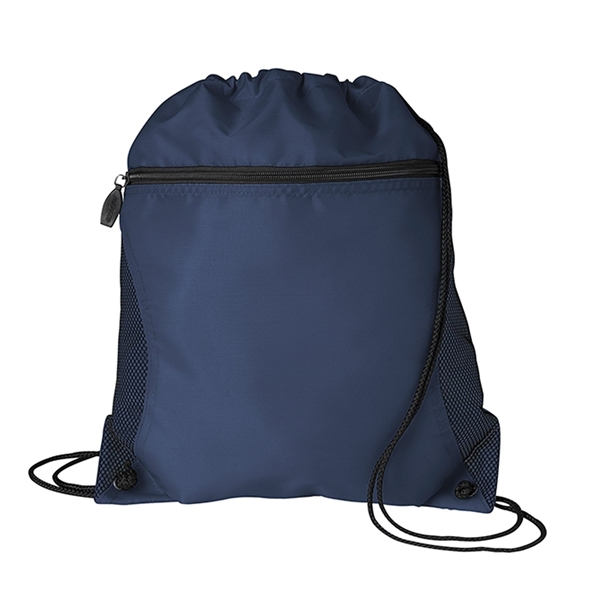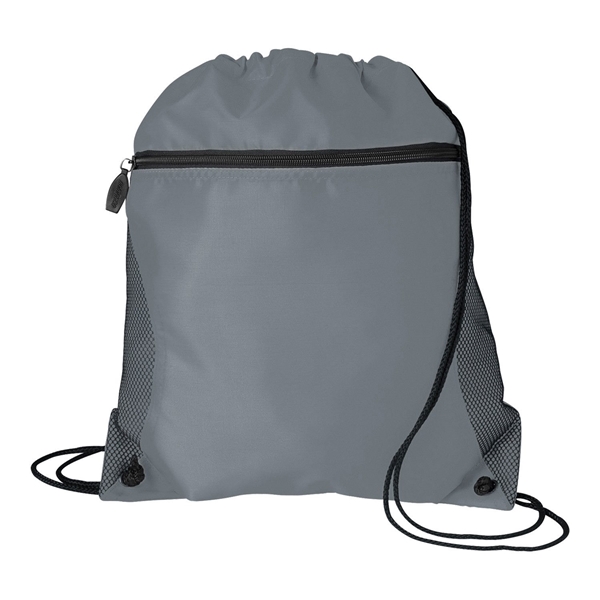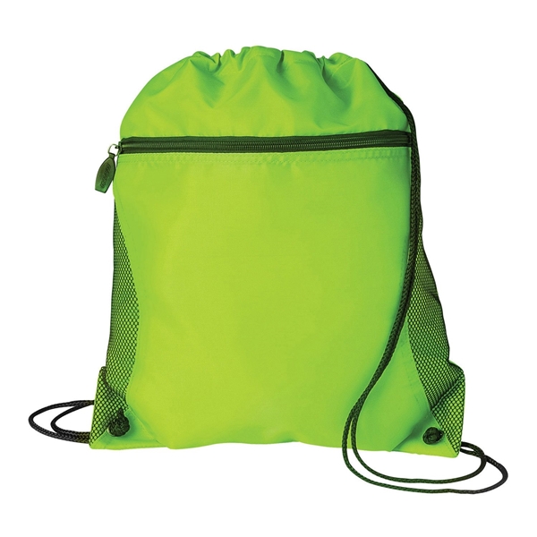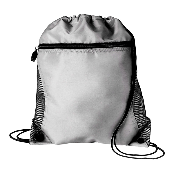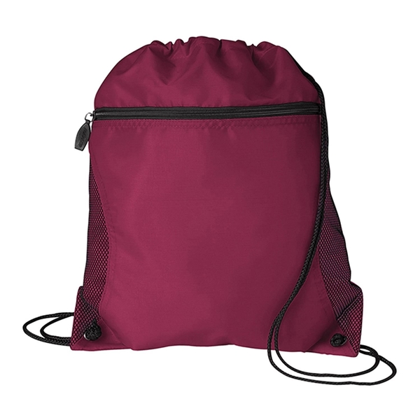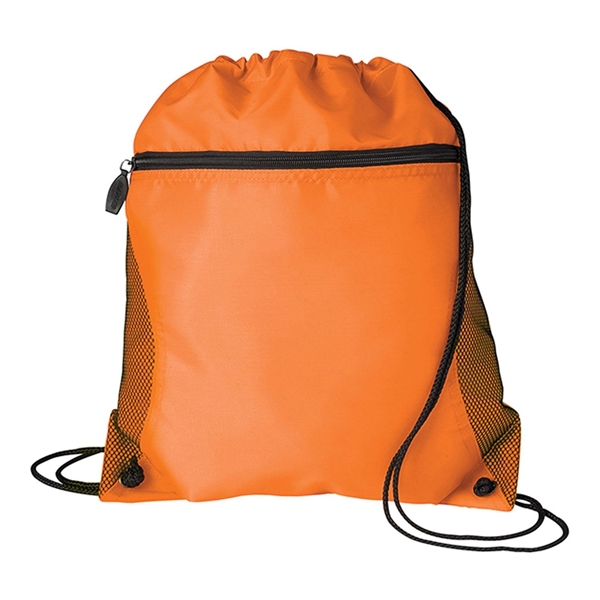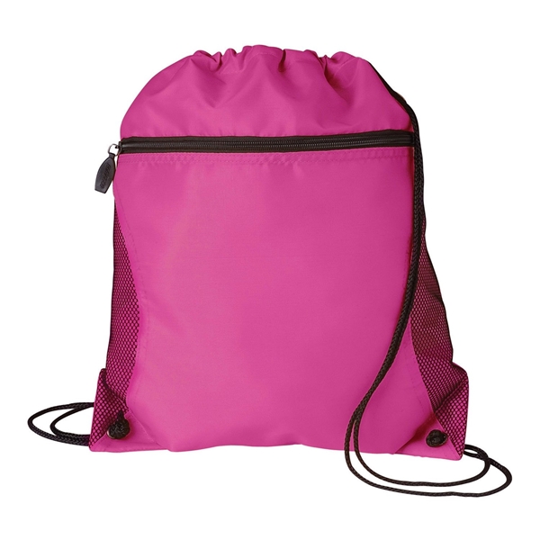 Stand out while you’re out and about with this lightweight polyester drawstring bag. It features a zippered front pocket with mesh sides, reinforced corners, and a double-drawcord closure.
