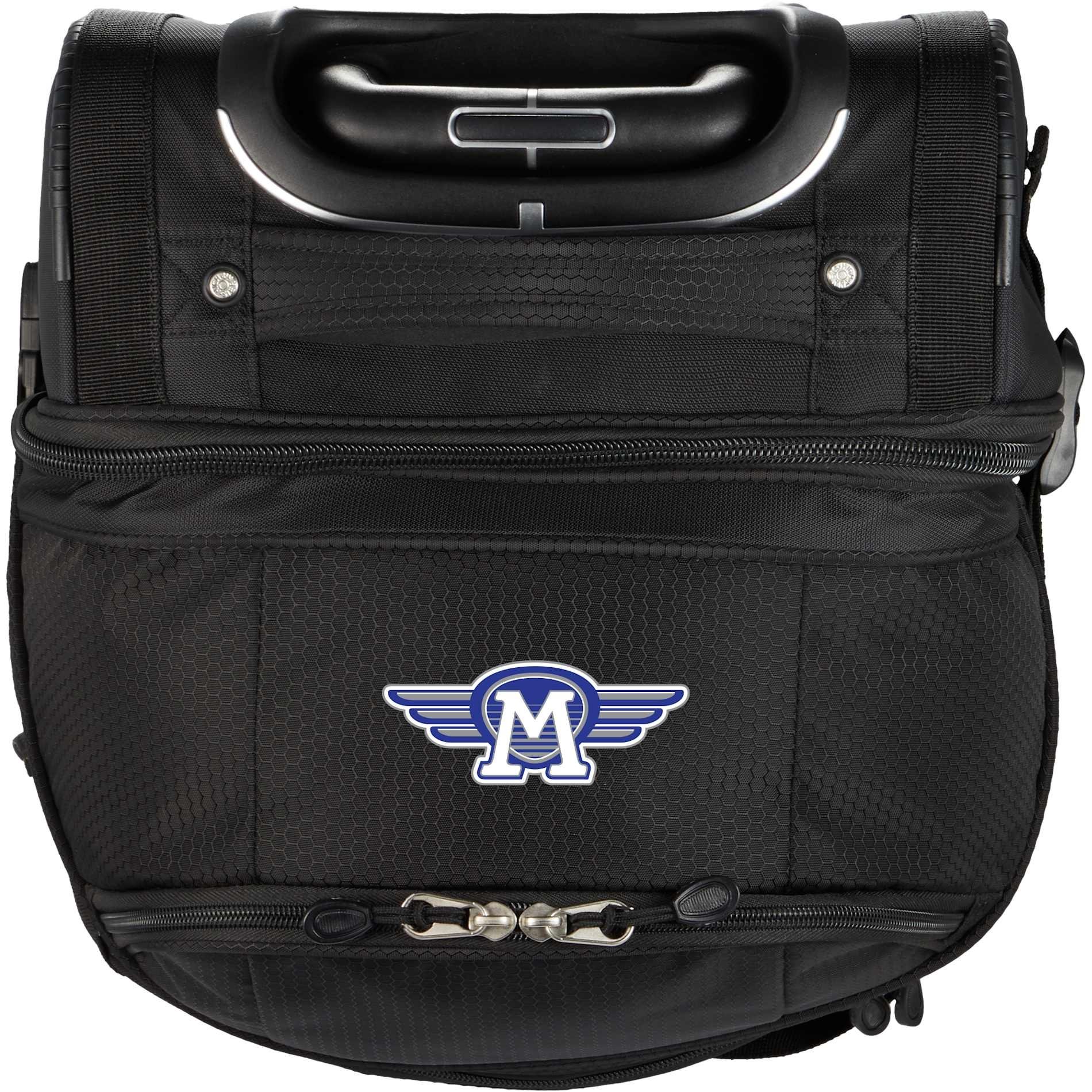 Designed for smooth transport, the duffle includes durable wheels and a telescoping pull handle for effortless maneuvering.