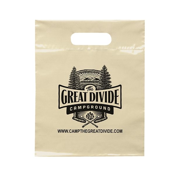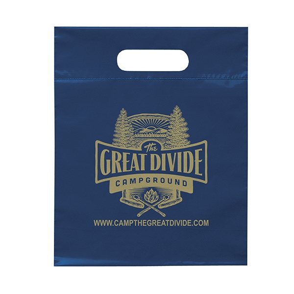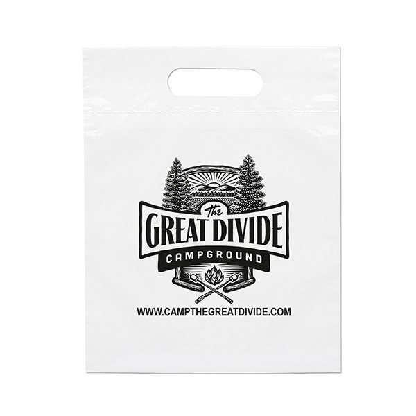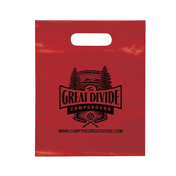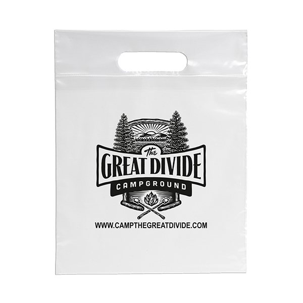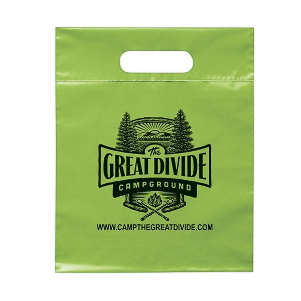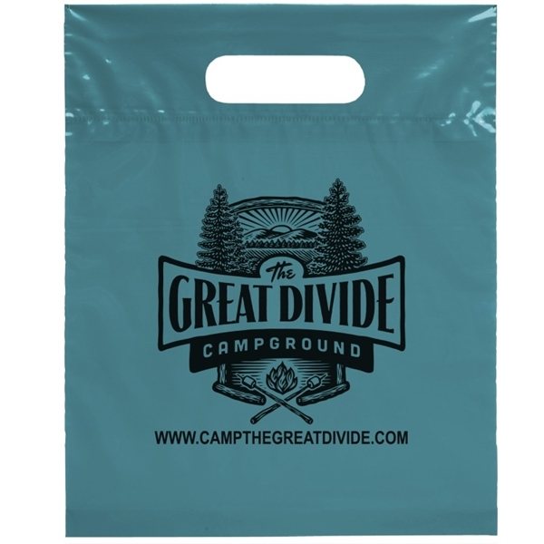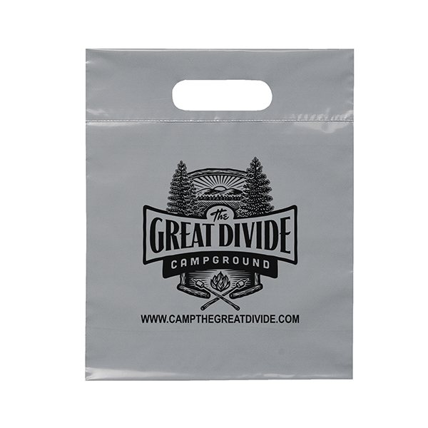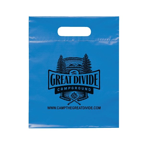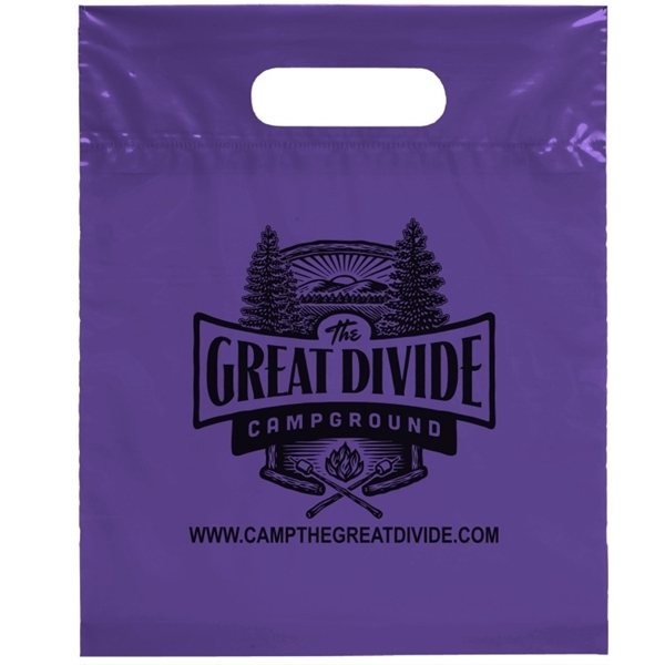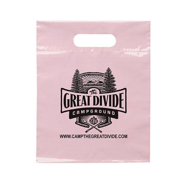 This 2.5 mil lo-density plastic bag features fold-over reinforced die cut handles.