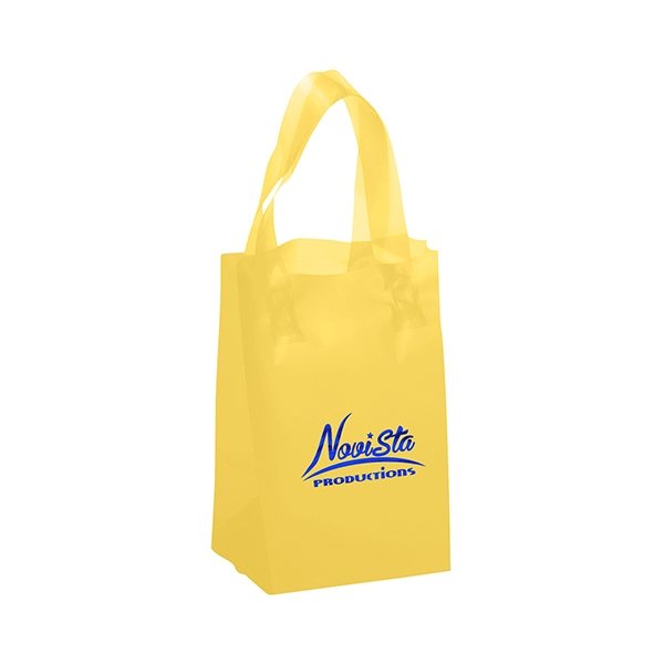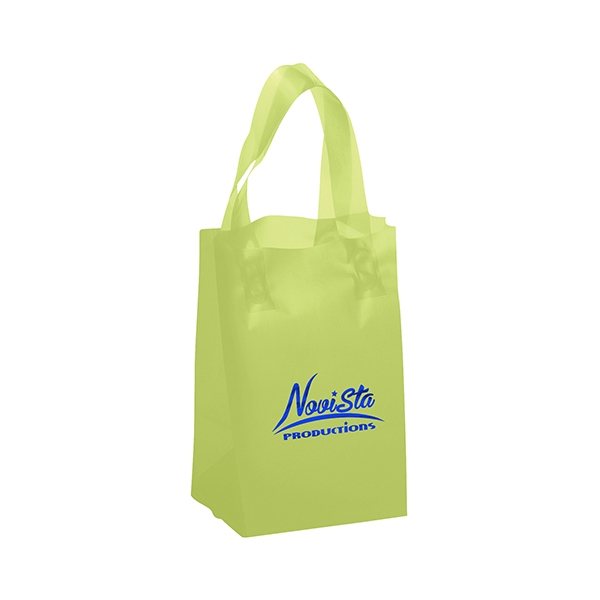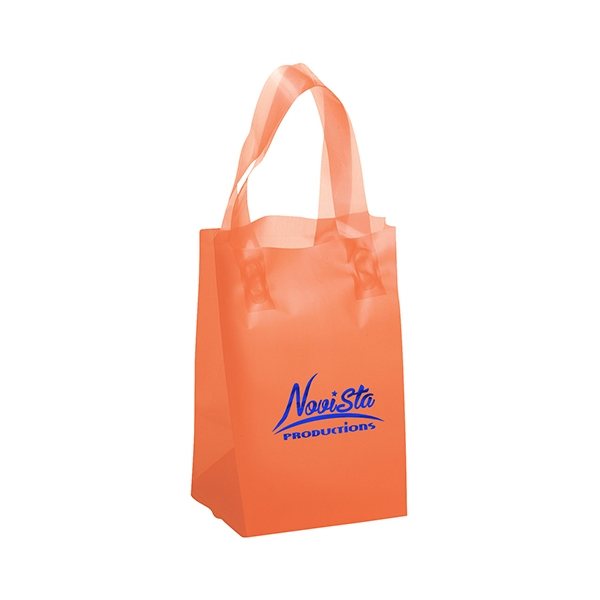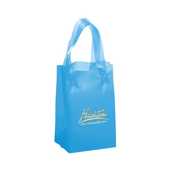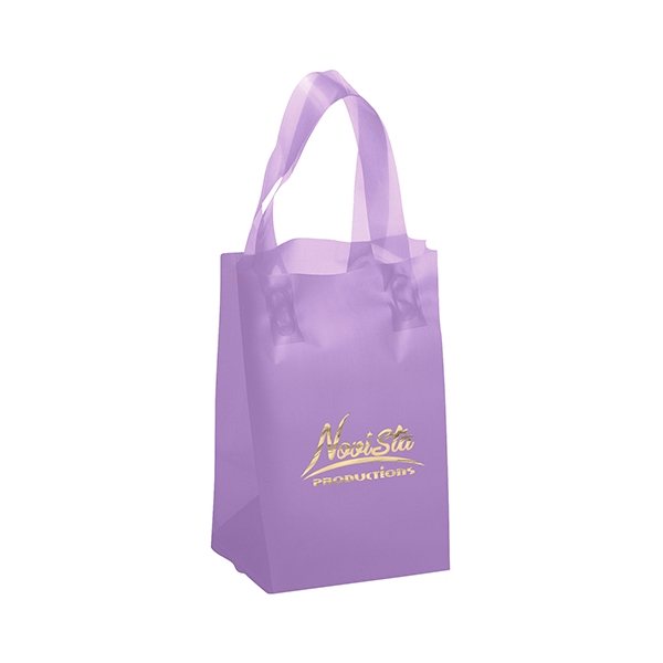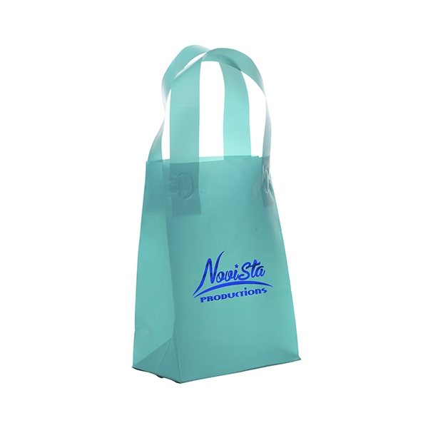 Colorful frosted hi-density plastic bag features fused loop handles and a cardboard bottom insert.