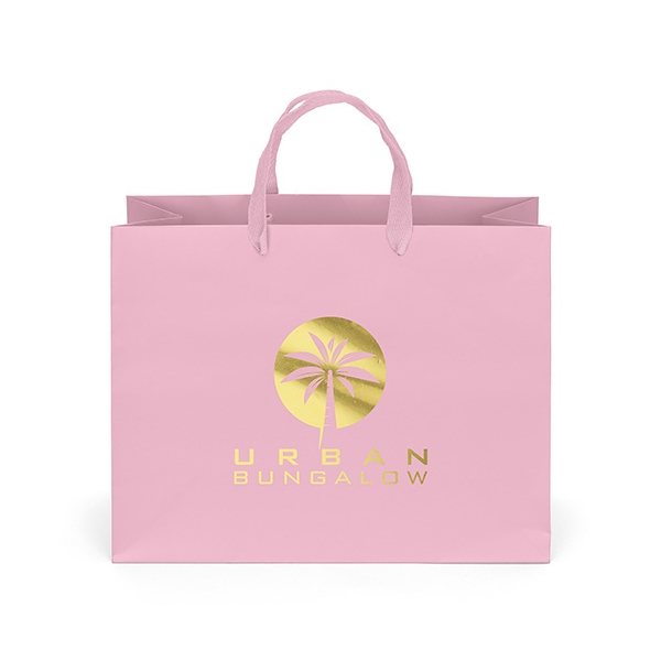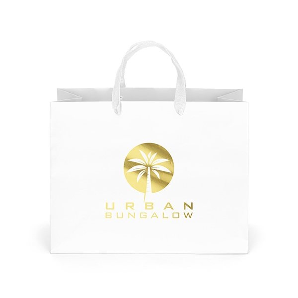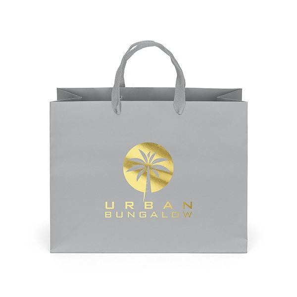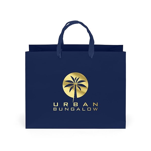 The London Matte Eurotote is made with matte-laminated paper and includes woven handles, a reinforced fold-over top, and a cardboard bottom insert.