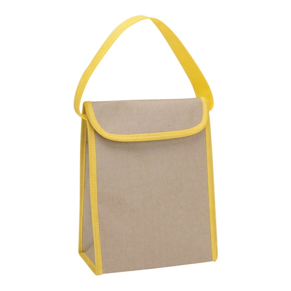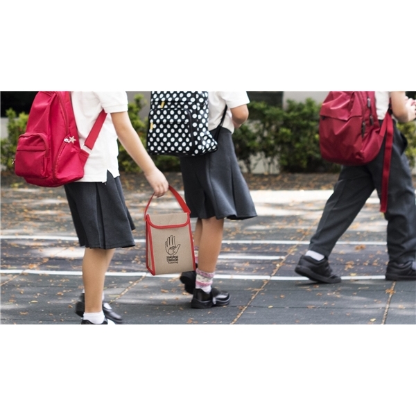 Kraft Lunch Bag with accent trim, a 19" handle, hook and loop tape closure, and is foam insulated.