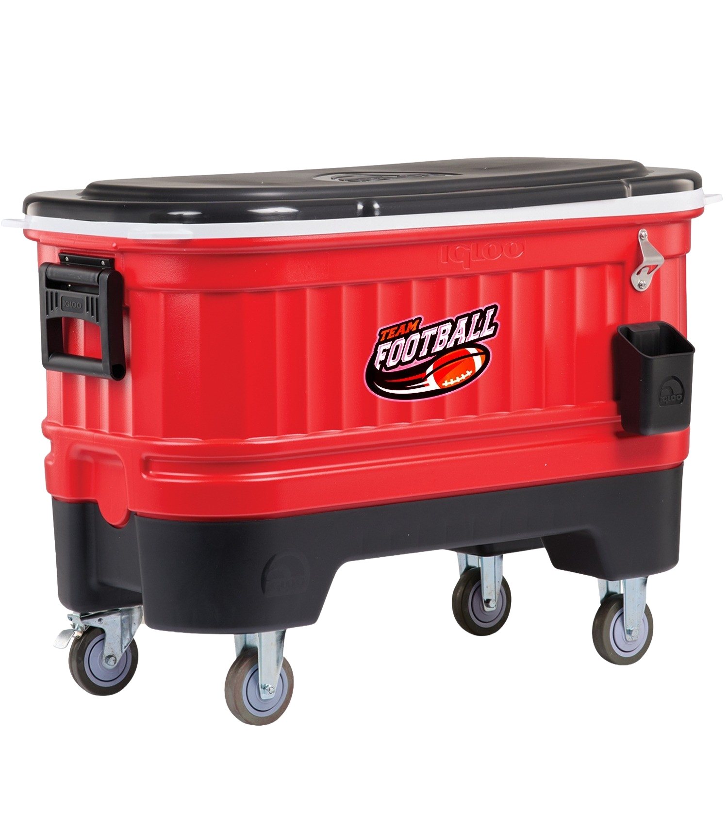 Host like a pro with locking swivel caster wheels, removable drink dividers, a bottle/wine caddy, and a built-in stainless bottle opener with cap-catch bin