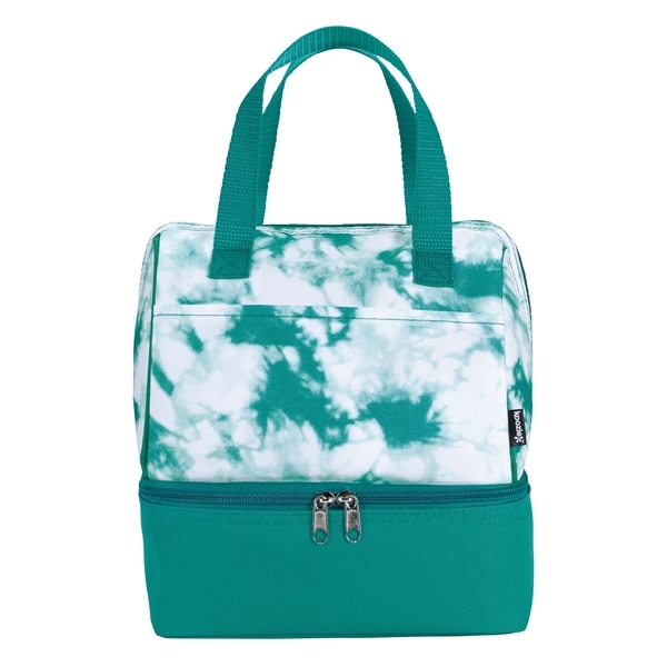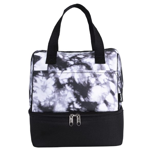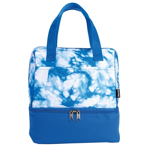 This trendy tie-dye polyester cooler is the perfect way to stand out in the lunch crowd! It features a front slip pocket, as well as two zippered main compartments with PEVA liners. You can also add in a couple of ice packs to help keep your food and beverages cold.