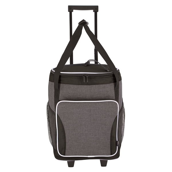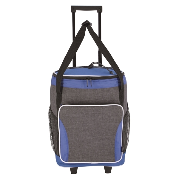 The zippered main compartment on this two-tone rolling cooler is large enough to carry all your favorite tailgate items! The mesh side pockets and the front zippered pocket provide additional storage. And with a collapsible handle and 4 high-quality wheels, transporting it is a breeze.
