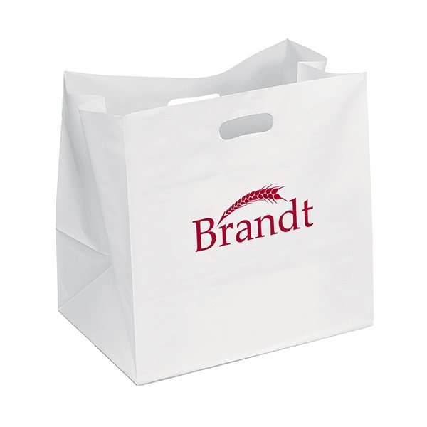 This 3.0 mil hi-density frosted white plastic die cut handle bag features a large bottom and side gusset and cardboard bottom insert to accommodate take-out containers and other items.