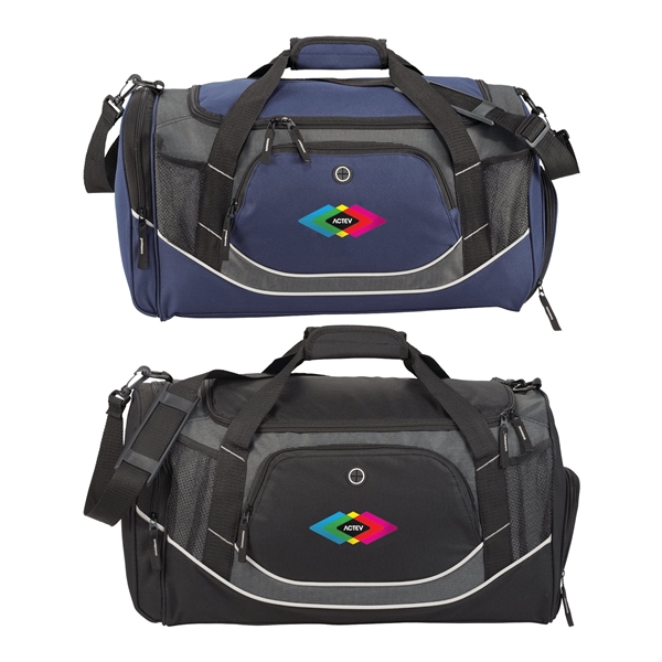 - This custom duffel bag includes a front zippered pocket with mesh accessory pockets and earbud port.