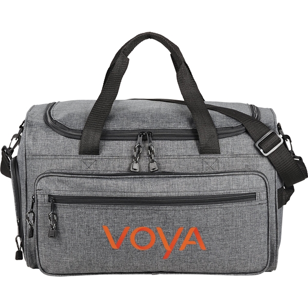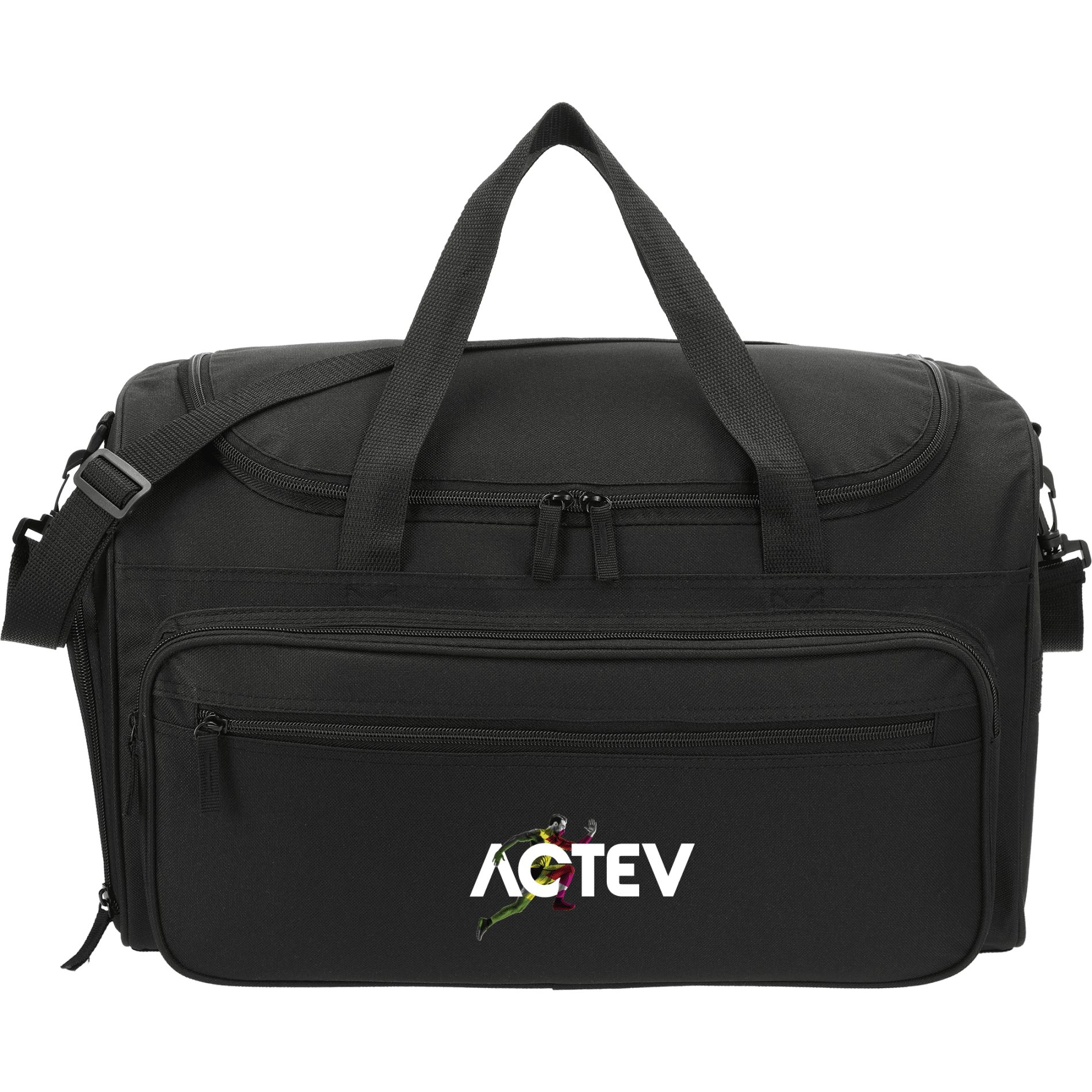 - This custom duffel bag includes a zippered end pocket, perfect for shoes, and a gusseted front pocket.