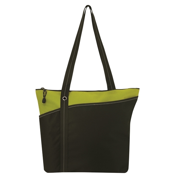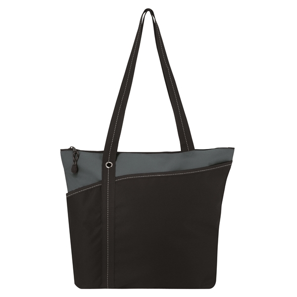 This zippered tote grabs attention with its two-toned design and stitching and grommet accents. Practically speaking, its main zippered compartment and two front slip pockets keep everything organized.