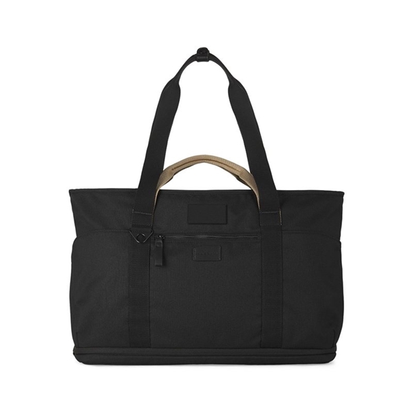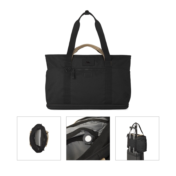 It features a large main compartment with lock-ready zippered closure, zippered RFID-secured pocket, hidden AirTag™ holder (AirTag not included), organizer pocket, carabiner key strap and 3" expandable base with reinforced stiffener for extra protection and storage needs