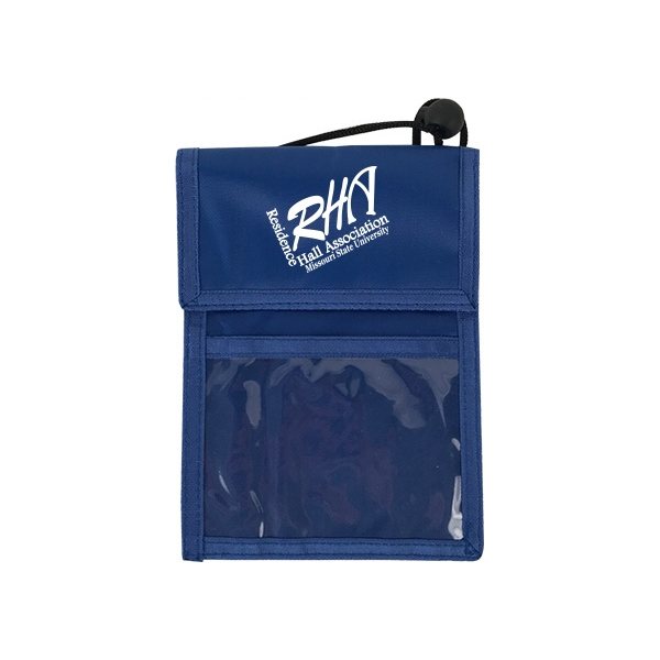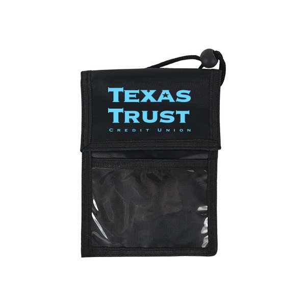 The 420 denier nylon neck wallet features one clear pocket for badges, one velcro pocket, one open pocket and a pen holder on the back.