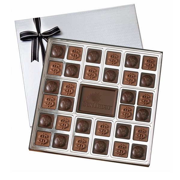 Surround a creamy milk or dark chocolate centerpiece with 3 lbs. of custom themed square-shaped chocolates.
