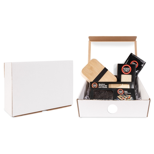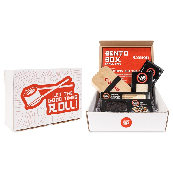 Mailer kit comes complete with a custom bamboo bento box filled with a sushi rolling mat and paddle set, nori seaweed sheets, sushi rice, and a miso soup packet.