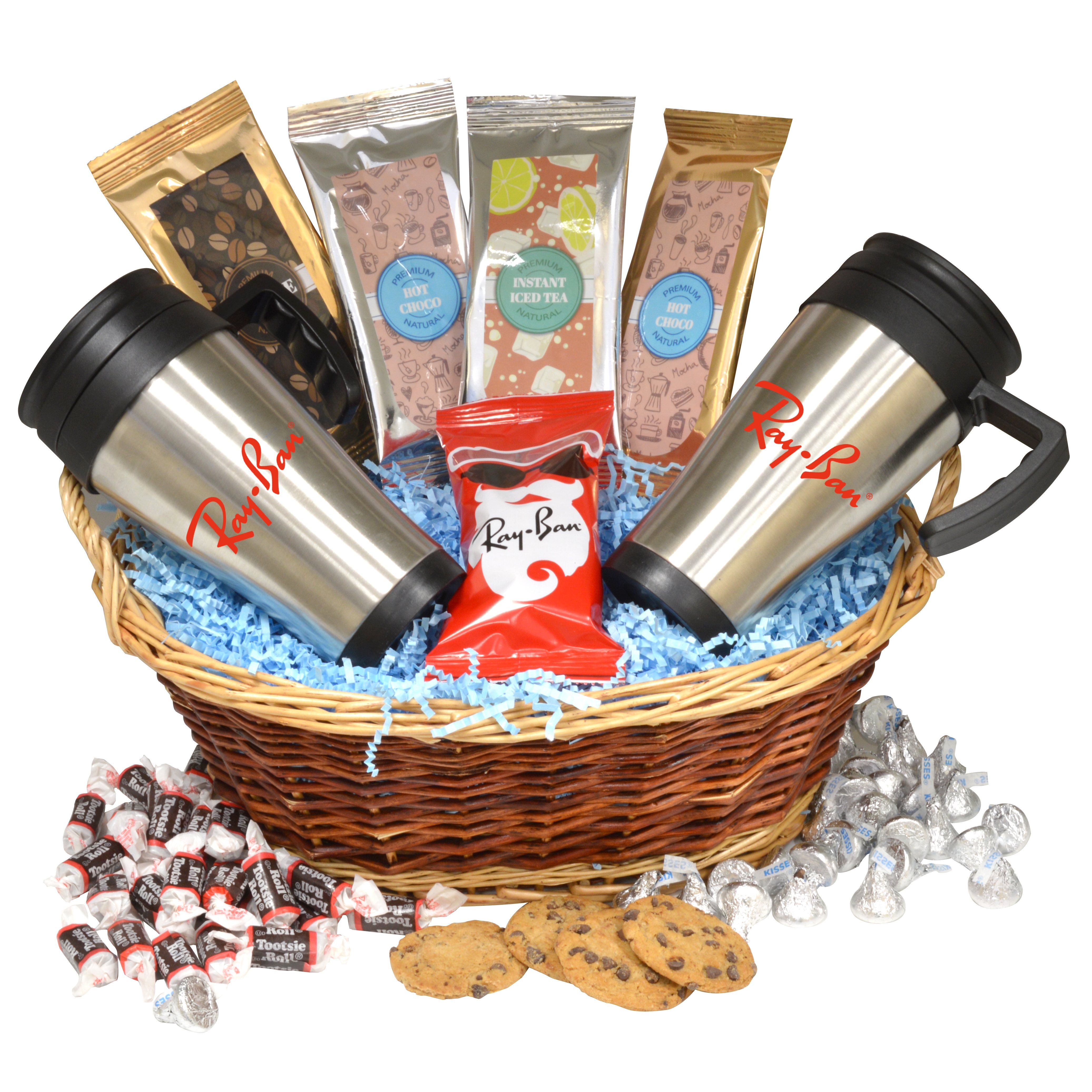 Gift basket with coffee, tea, 2 packets of hot chocolate, 2 stainless steel travel mugs and Chocolate Covered Peanuts