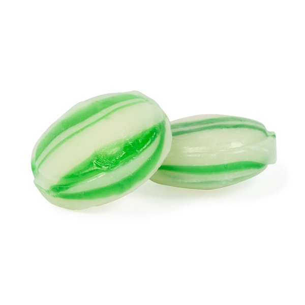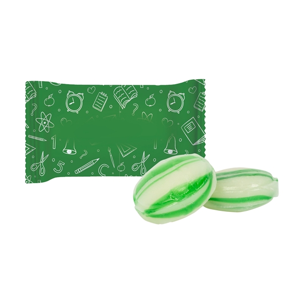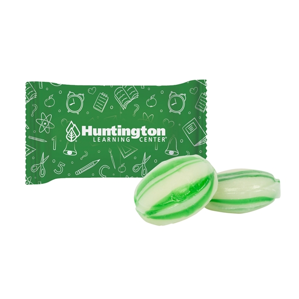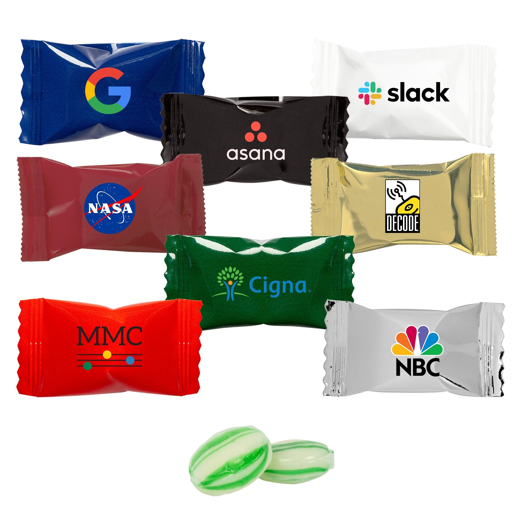 Wrapped green striped spearmint mega mint. Easy to put in a purse or a pocket, your customers and guests will be reminded of your company name every time they pull these out!