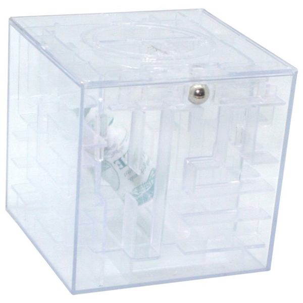 - It's a cube measuring 3.5" that comes in clear or blue and is a clever puzzle that keeps treasure locked up until you successfully complete the maze