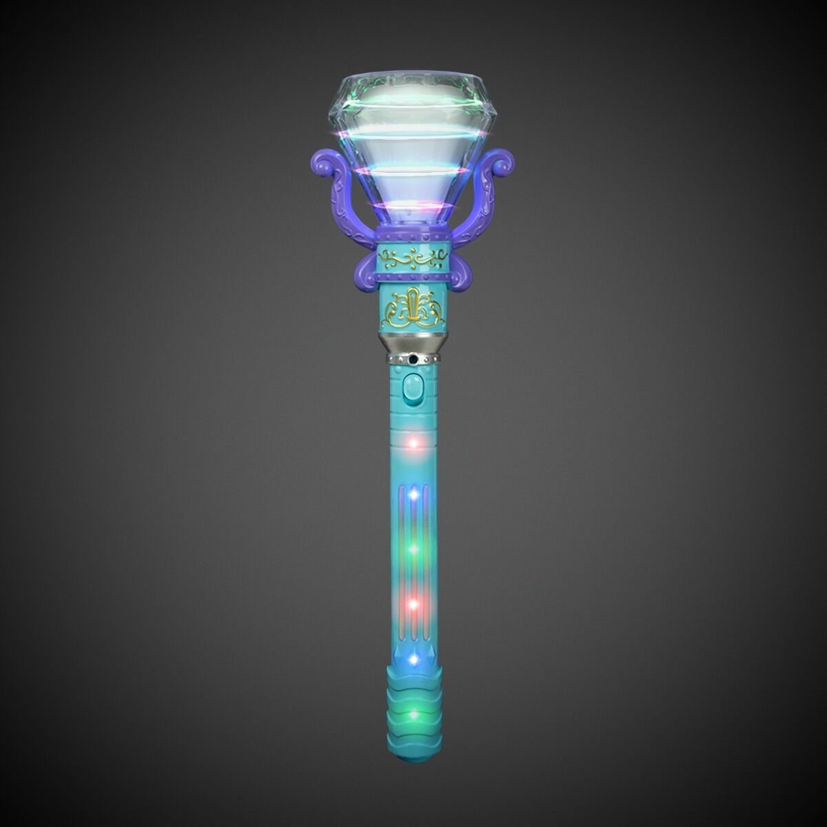 Slide the switch on the blue handle up to spin the multicolor LEDs inside the clear diamond.