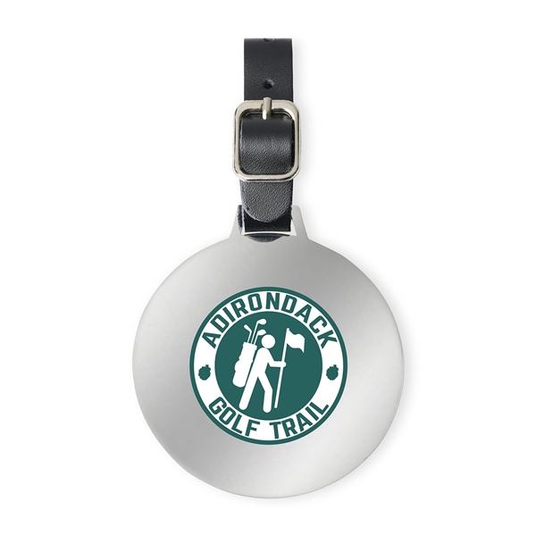 The shiny silver nickel tag features a black leather strap attachment with nickel buckle