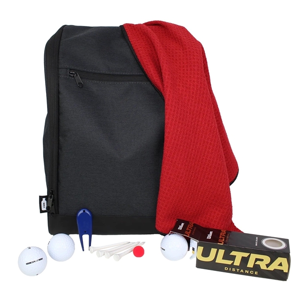 This kit features a shoe bag made from 100% RPET, a 15 X 18 waffle golf towel made from 100% recycled materials, a plastic divot tool, ball marker, (4) wooden 2-3/4" golf tees and a box of 3 Wilson Ultra golf balls