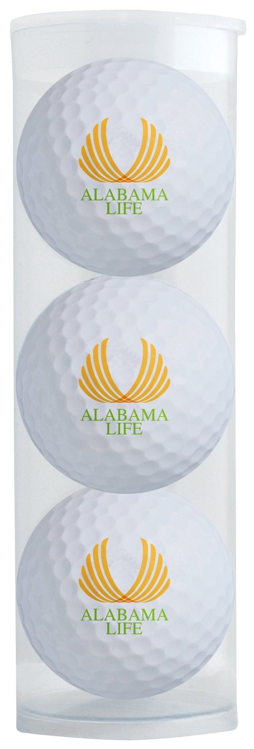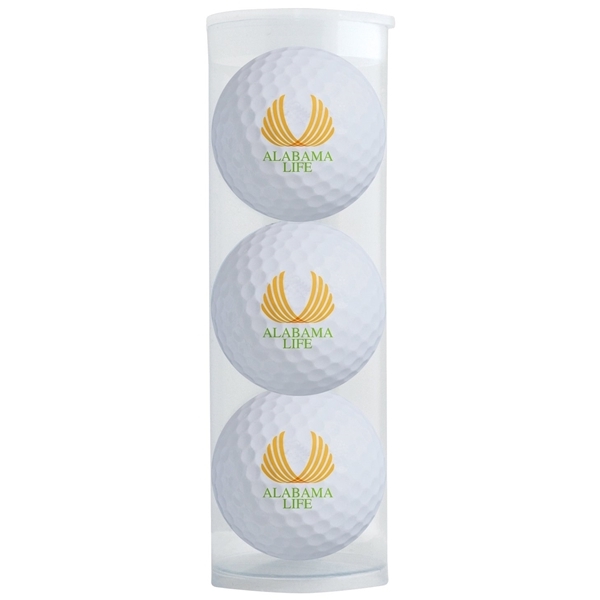 Three customized TaylorMade® Distance Plus golf balls packaged in a clear plastic tube