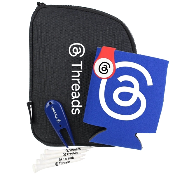 This kit features a valuables pouch made from 100% RPET, a collapsible foam can cooler, a plastic divot tool, (4) wooden 2-3/4" golf tees and the new rubber silicone hat clip called the ACECLIP