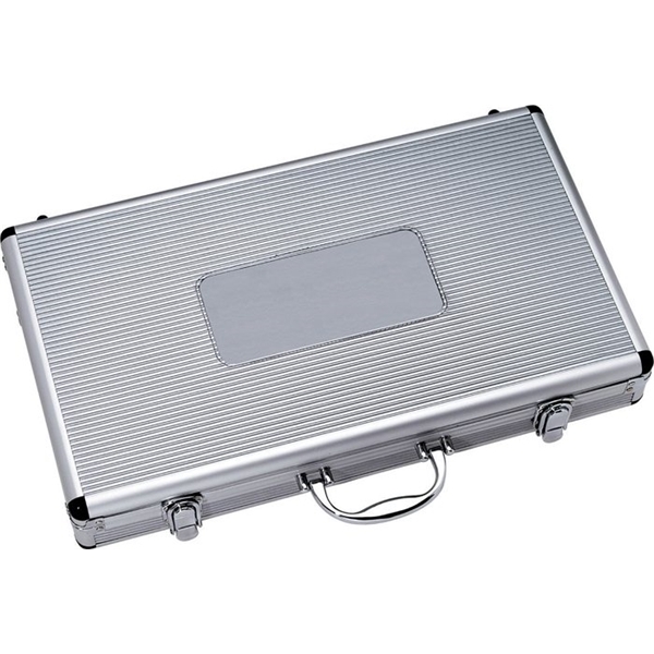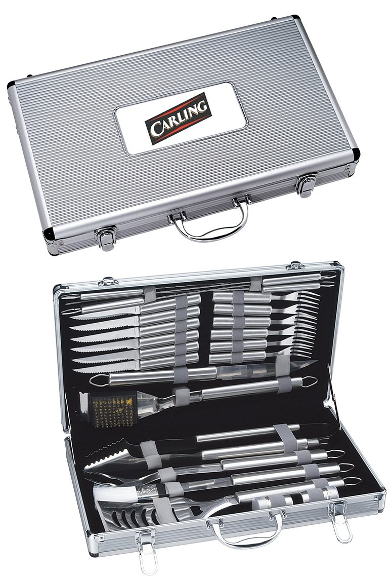 - Includes spatula with built in serrated blade and bottle opener, fork, sauce brush, tongs, cutting knife, grill cleaner, 6 steak knives, 6 forks, 4 BBQ skewers and seasoning shakers