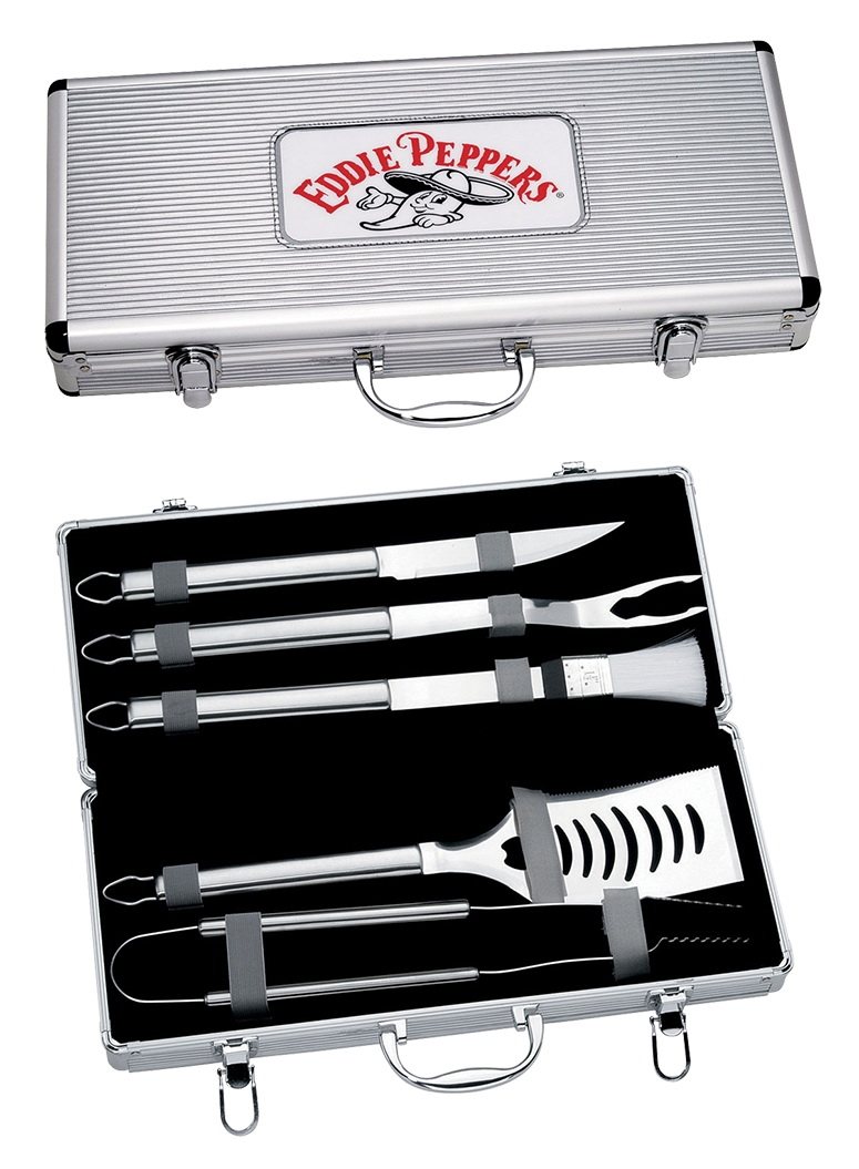 - Includes spatula with built in serrated blade and bottle opener, tongs, fork, cutting knife and sauce brush