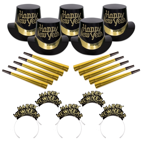 Black and Gold Tiffany New Year's Eve Party Kit for 10 People Each kit comes with; 5 Happy New Year satin-gold rimmed black top hats.