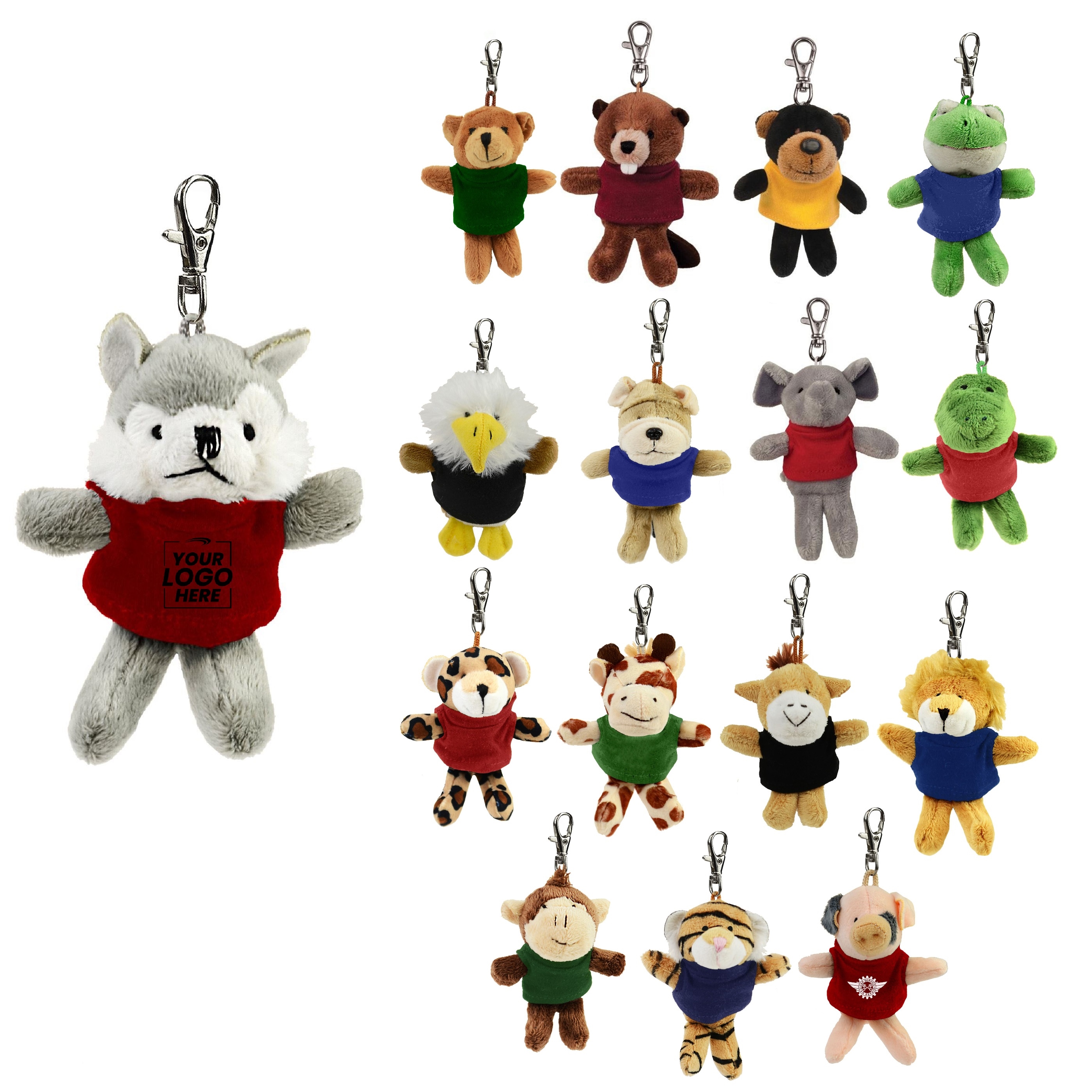 Each cuddly Chelsea Teddy Bear™ plush delivers joy and excitement. Make your next school fundraiser or family-focused event more fun with this wild bunch of mini 4" - 4.5" plushies! These cool creatures clip to a backpack, diaper bag, or key ring using a lobster-claw clasp. Each small stuffed animal comes dressed in an cute RPET T-shirt and is CPSIA rated for ages 0+. 98% of overall T-shirt is made of post-consumer recycled PET