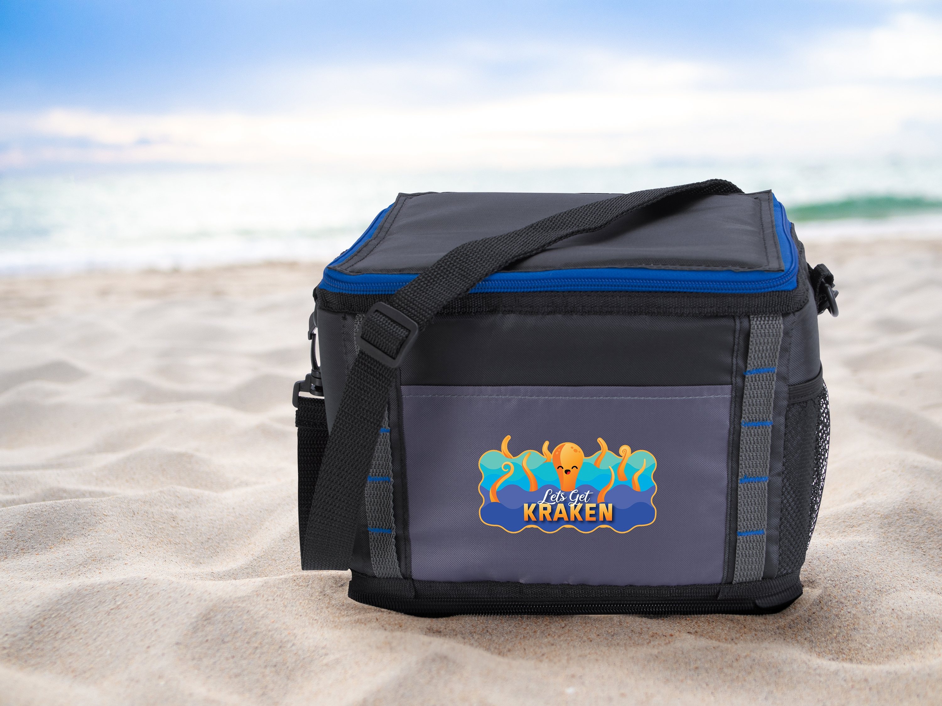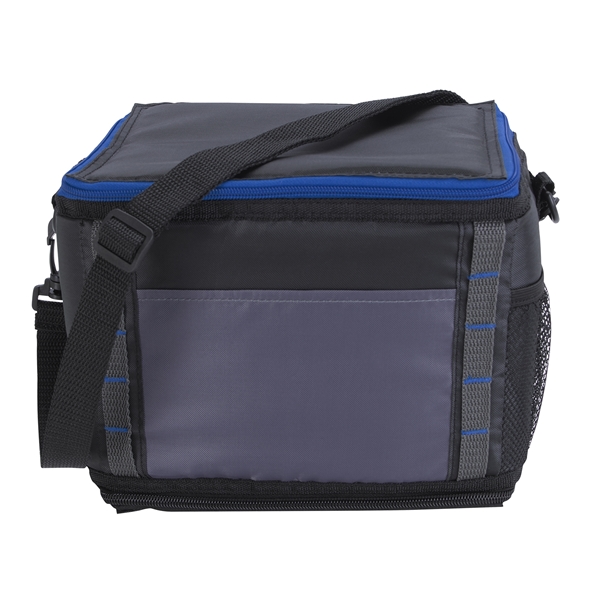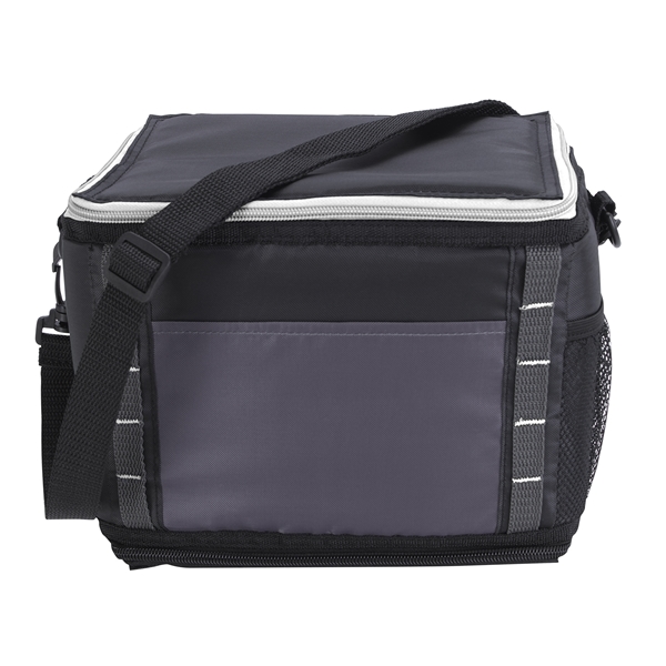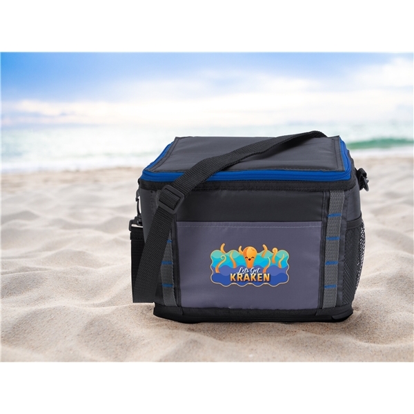 Chill by FlexiFreeze® 9-Can Cooler can hold nine 12 oz cans, has a front slip pocket and a daisy chain accent, and features upper and lower zippers for easy collapsing.