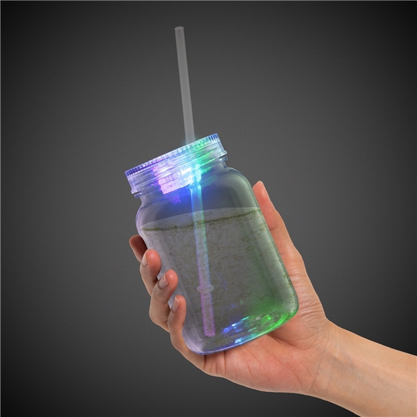 This Multi Color LED 20oz Clear Mason Jar with Straw and Lid is an on-the-go drink container that is bound to turn plenty of heads!