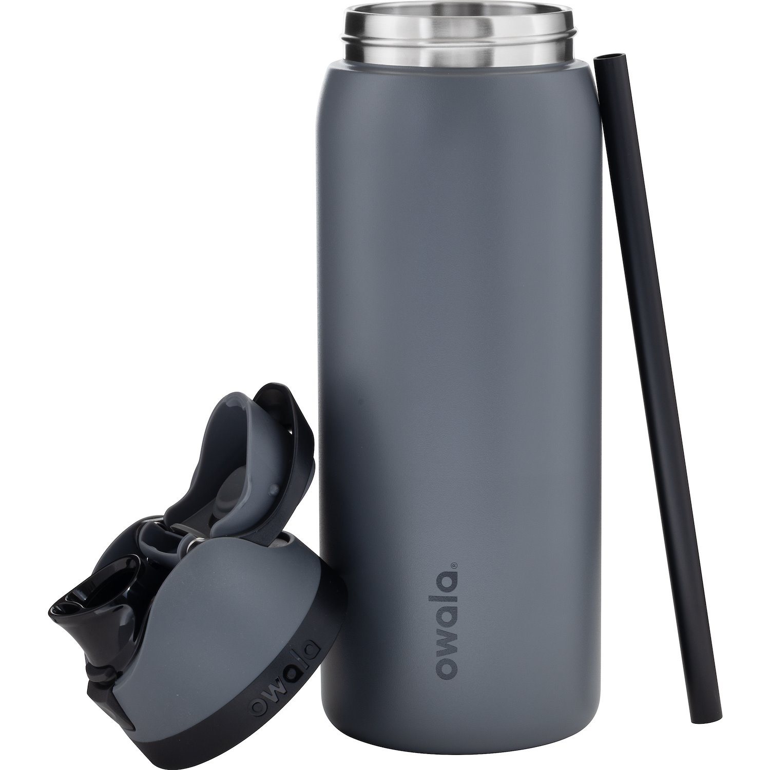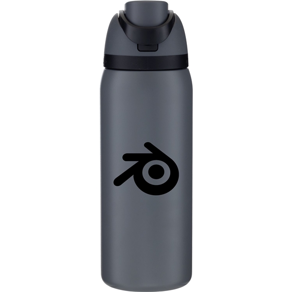 32 oz double wall 18/8 stainless steel thermal bottle with copper vacuum insulation, dual-purpose threaded lid, push-button locking mechanism, sip opening, built-in straw, and powder coated finish