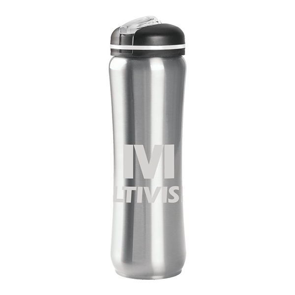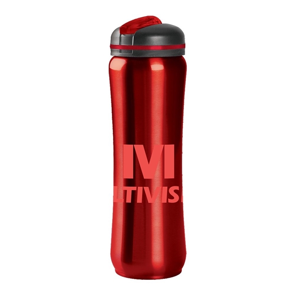 28 oz 18/8 single wall slim stainless steel water bottle with bold metallic color finish; contour shape easy-to-grip bottle; black twist-on lid with color stripe accent; flip-up matching color translucent spout.