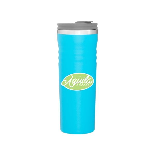 • 16.9 oz double wall tumbler with 18/8 stainless steel inner wall, stainless steel outer wall, vacuum insulation, push-on lid, swivel closure, stainless steel rim, and powder coated finish