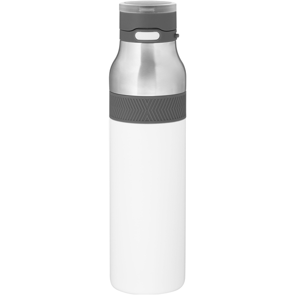 • 20.9 oz double wall 18/8 stainless steel thermal bottle with copper vacuum insulation, threaded one-touch push-button lid with locking mechanism, carrying handle, color accent, and powder coated finish · gift box included