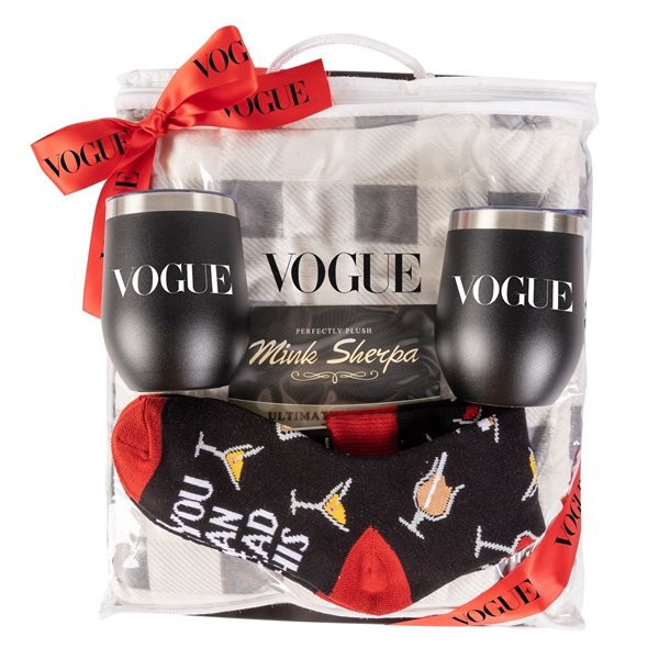 Our 50"x60" Micro Soft Touch Sherpa Blanket with custom card comes paired with a set of 2, 12oz, custom vacuum wine tumblers and our stock ACE "If you can read this bring me a cocktail" socks wrapped in a tray with a personalized custom ribbon.
