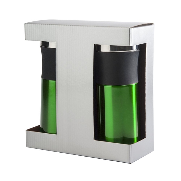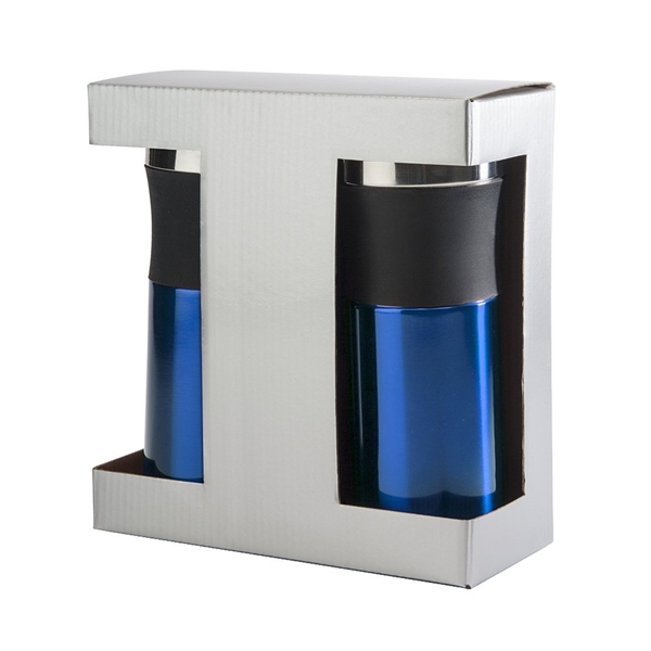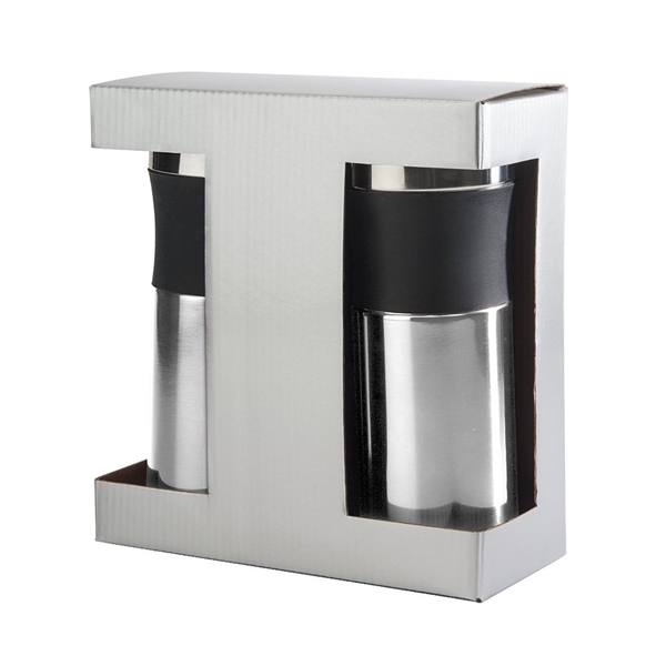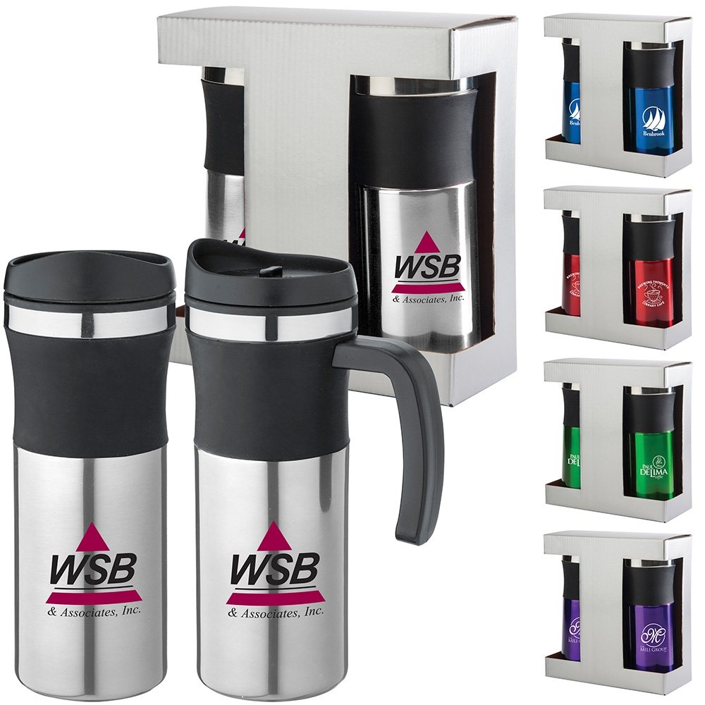 Two piece gift set with 16 oz. double wall stainless Malmo travel mug and matching 16 oz. double wall stainless Malmo tumbler.