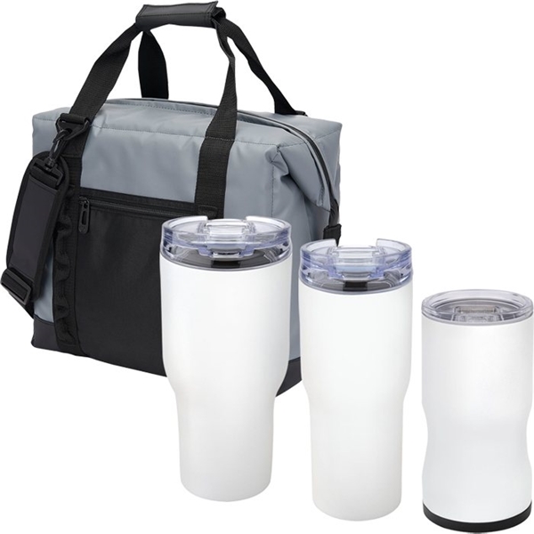3 drinkware styles packaged inside of the Urban Peak® Waterproof 24 Can Cooler Bag