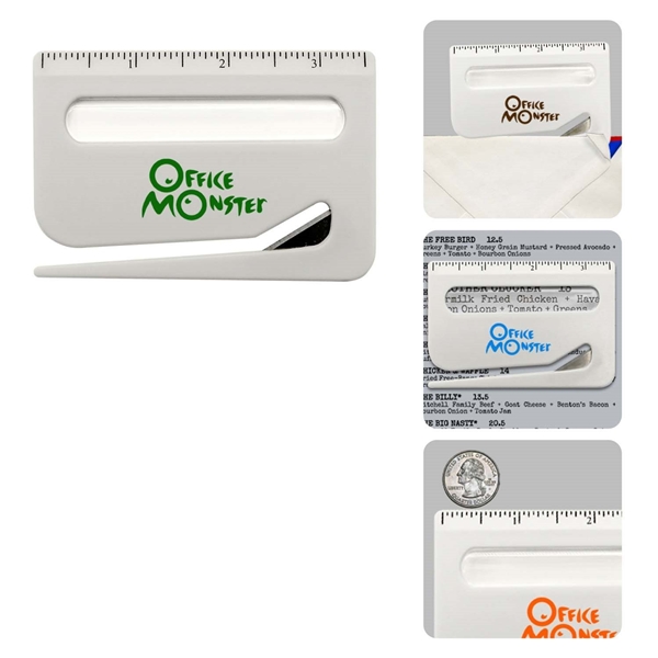 This multi function tool includes a letter opener, magnifier, and ruler.