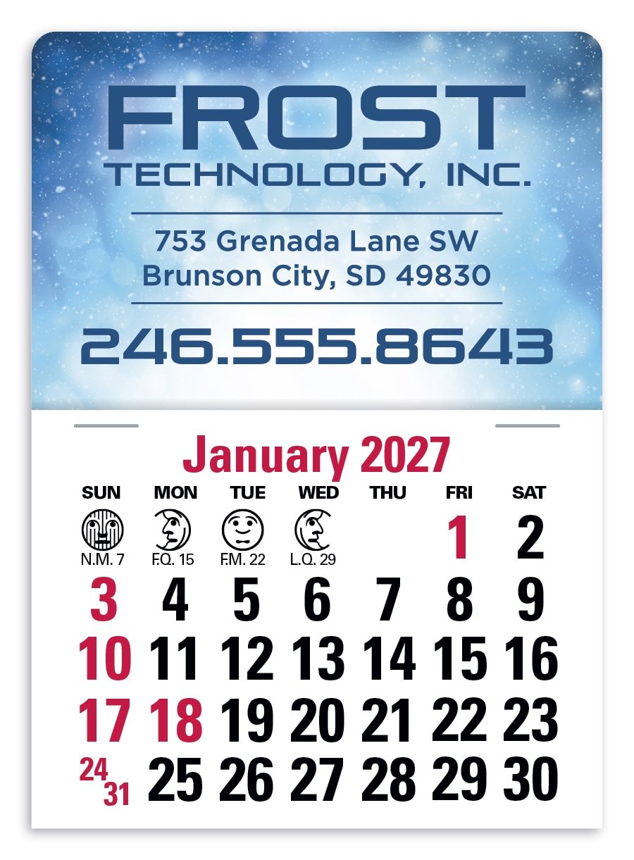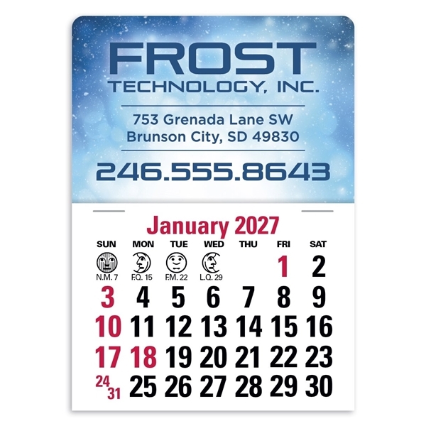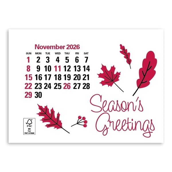 This 14-month calendar offers the choice of six full-color header shapes so you can create a look that reflects your brand's style. Once you have your calendar in hand, the options for placement are nearly limitless thanks to the Press-N-Stick feature, which also makes the calendar easily removable. The FSC® label means that the materials used for this product come from well-managed FSC®-certified forests and other controlled sources.
