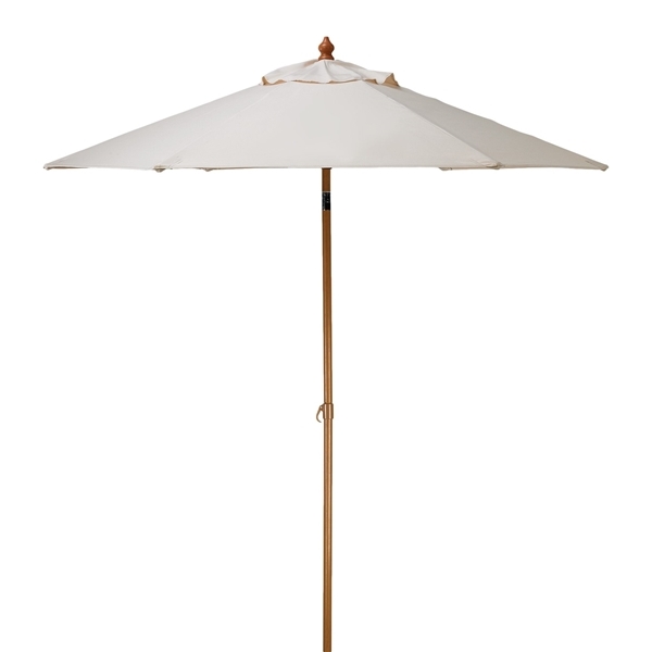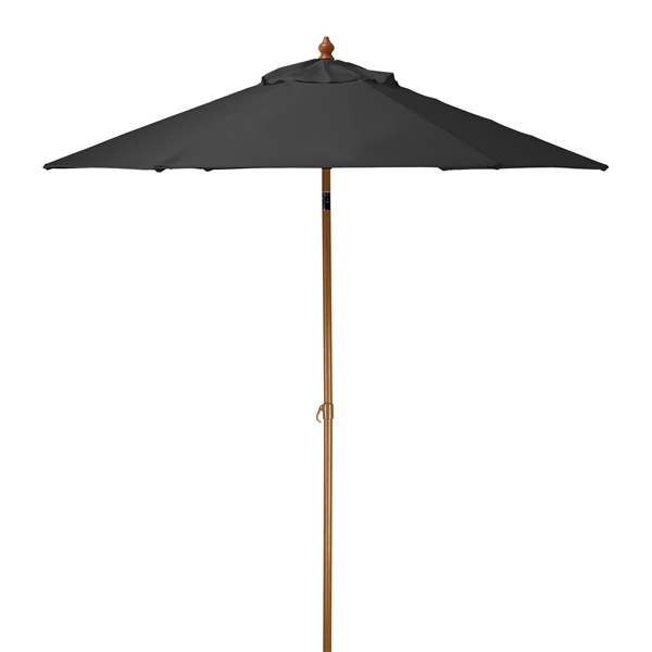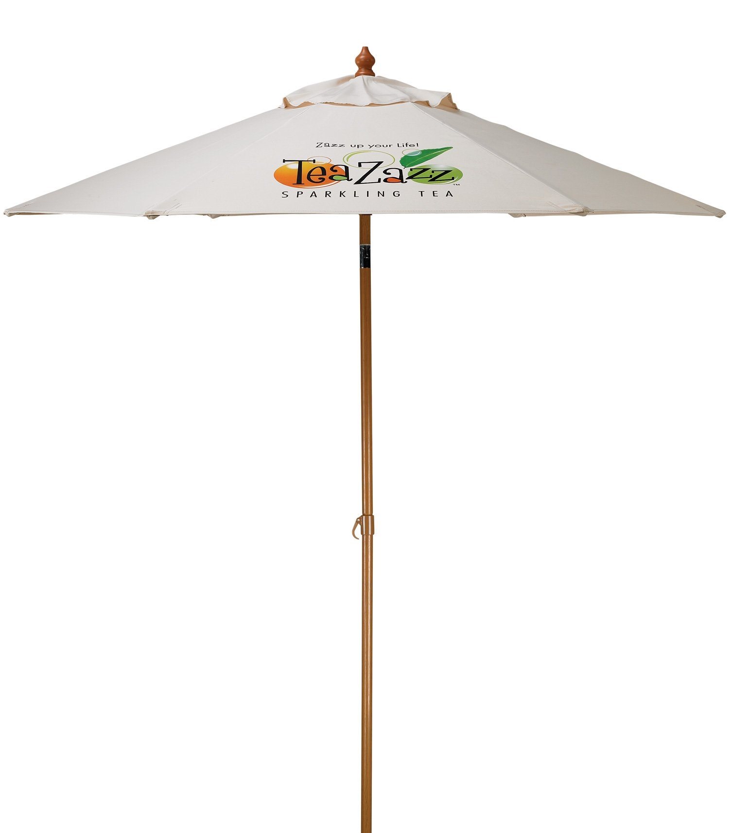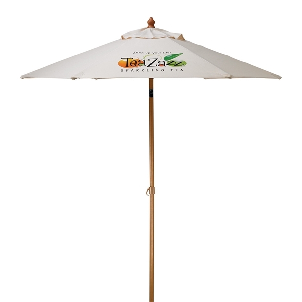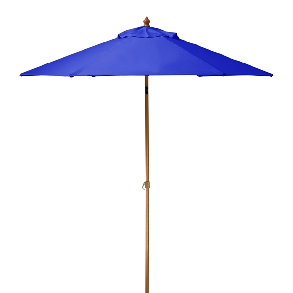 Measuring 7 feet, features of this umbrella include 6 panels, wood-grain finished steel frame with tilt, traditional steel ribs, plastic ferrule and runner, and a heavy 8 oz. polyester cover.