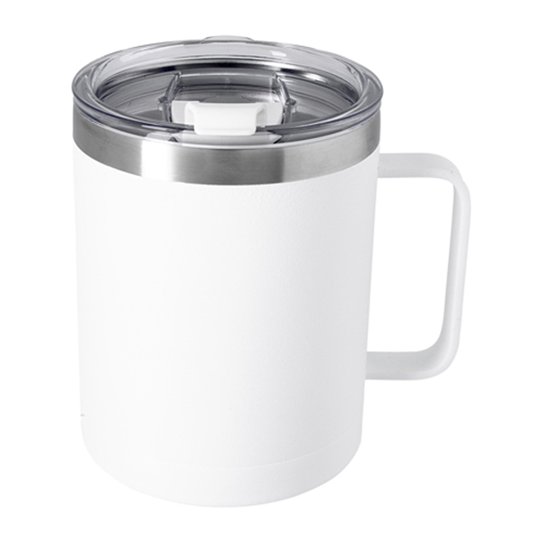 The Viking Collection® 14 oz Stainless Steel Camp Mug, vacuum-sealed, copper lining, powder-coated, with a flip lid and straw hole.