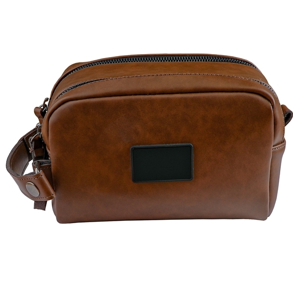 This modern dopp kit is crafted from leather and features a large dual metal zipper opening, spacious interior, and durable handles.