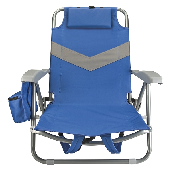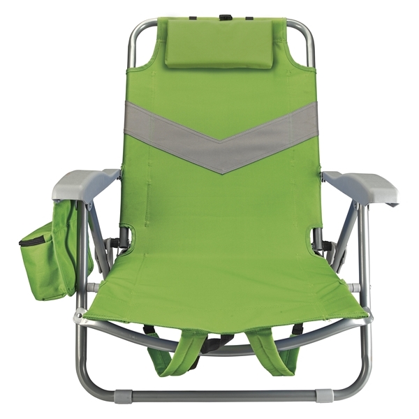 Have a great time at the beach with this bold and sporty Koozie® chair! The comfortable padded shoulder straps make carrying it a breeze. With an attached Koozie® cooler, removable padded headrest, four recline positions, and rubber carry handle, your ultimate chill day at the beach just got better!