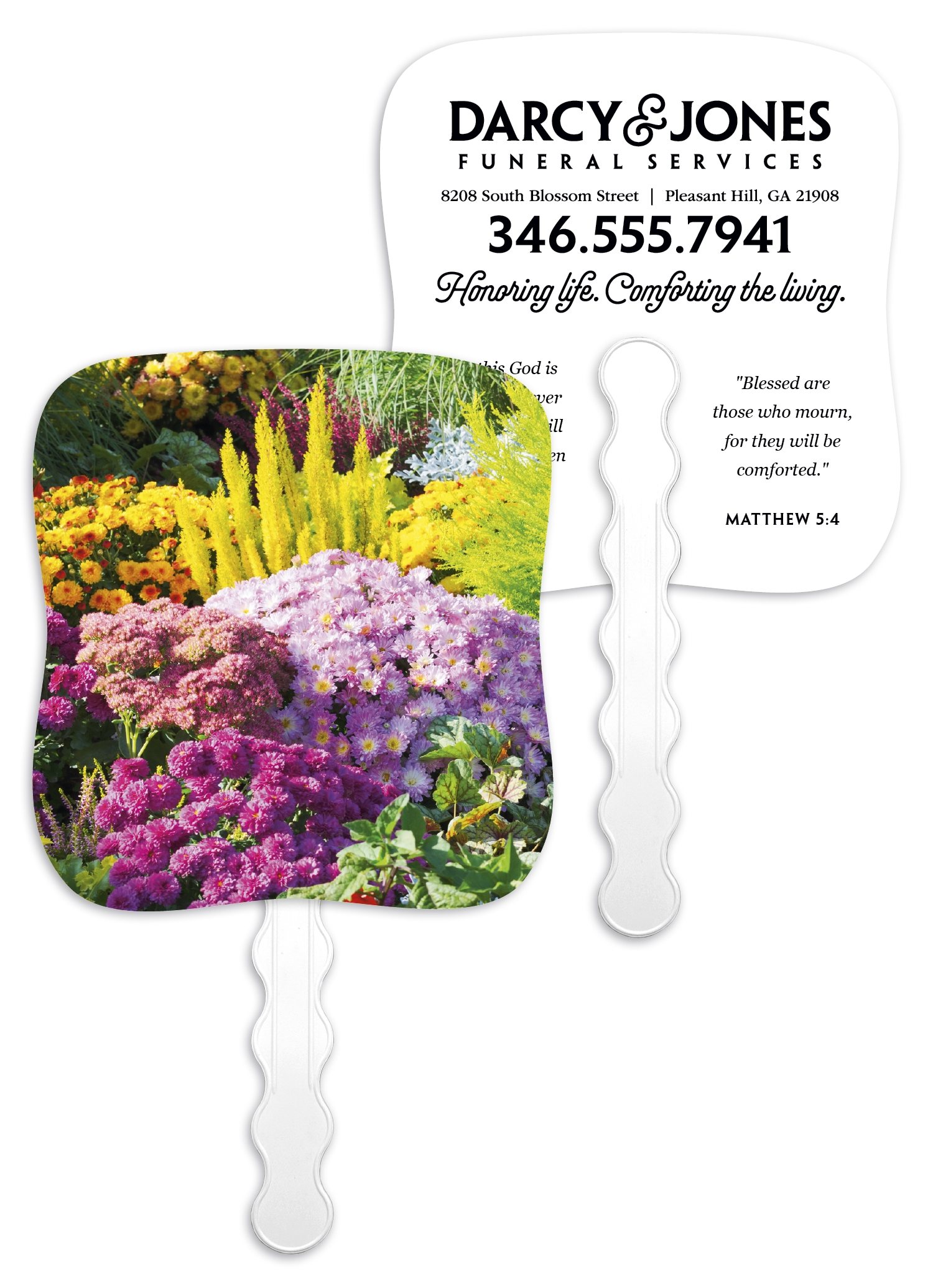 Stay cool and spread your message with this beautifully designed hand-held paper fan featuring an uplifting image on the front and your imprint on the back. Perfect for so many occasions, it combines practicality with a meaningful message, adding elegance to your event while keeping attendees feeling refreshed. The FSC® label means that the materials used for this product come from well-managed FSC®-certified forests and other controlled sources.